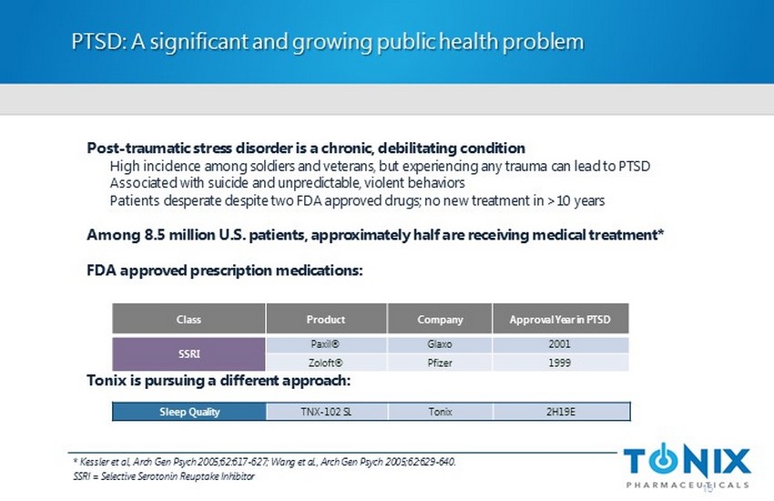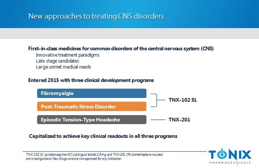 Safe harbor statement 2 Certain statements in this presentation regarding strategic plans, expectations and objectives for future operations or results are “forward - looking statements” as defined by the Private Securities Litigation Reform Act of 1995 . These statements may be identified by the use of forward - looking words such as “anticipate,” “believe,” “forecast,” “estimate” and “intend,” among others . These forward - looking statements are based on Tonix’s current expectations and actual results could differ materially . There are a number of factors that could cause actual events to differ materially from those indicated by such forward - looking statements . These factors include, but are not limited to, substantial competition ; our possible need for additional financing ; uncertainties of patent protection and litigation ; uncertainties of government or third party payor reimbursement ; limited research and development efforts and dependence upon third parties ; and risks related to failure to obtain U . S Food and Drug Administration clearances or approvals and noncompliance with its regulations . As with any pharmaceutical under development, there are significant risks in the development, regulatory approval and commercialization of new products . The forward - looking statements in this presentation are made as of the date of this presentation, even if subsequently made available by the Company on its website or otherwise . Tonix does not undertake an obligation to update or revise any forward - looking statement, except as required by law . Investors should read the risk factors set forth in the Annual Report on Form 10 - K for the year ended December 31 , 2014 , as filed with the Securities and Exchange Commission (the “SEC”) on February 27 , 2015 and future periodic reports filed with the SEC on or after the date hereof . All of the Company's forward - looking statements are expressly qualified by all such risk factors and other cautionary statements .