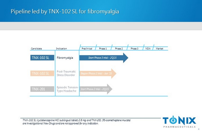 New approaches to treating CNS disorders First - in - class medicines for common disorders of the central nervous system (CNS) Innovative treatment paradigms Late stage candidates Large unmet medical needs Entered 2015 with three clinical development programs 3 Fibromyalgia Post - Traumatic Stress Disorder Episodic Tension - Type Headache TNX - 102 SL TNX - 201 TNX - 102 SL (cyclobenzaprine HCl sublingual tablet) 2.8 mg and TNX - 201 ((R) - isometheptene mucate ) are Investigational New Drugs and are not approved for any indication. C apitalized to achieve key clinical readouts in all three programs