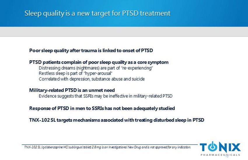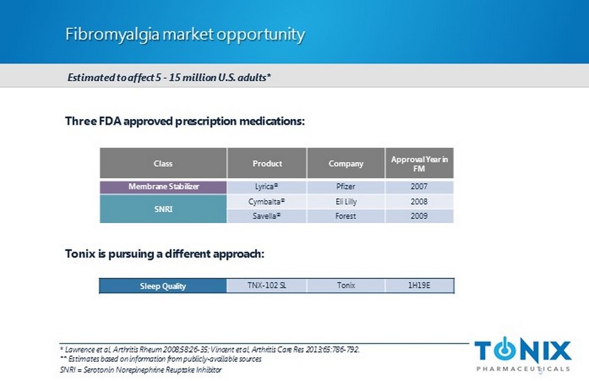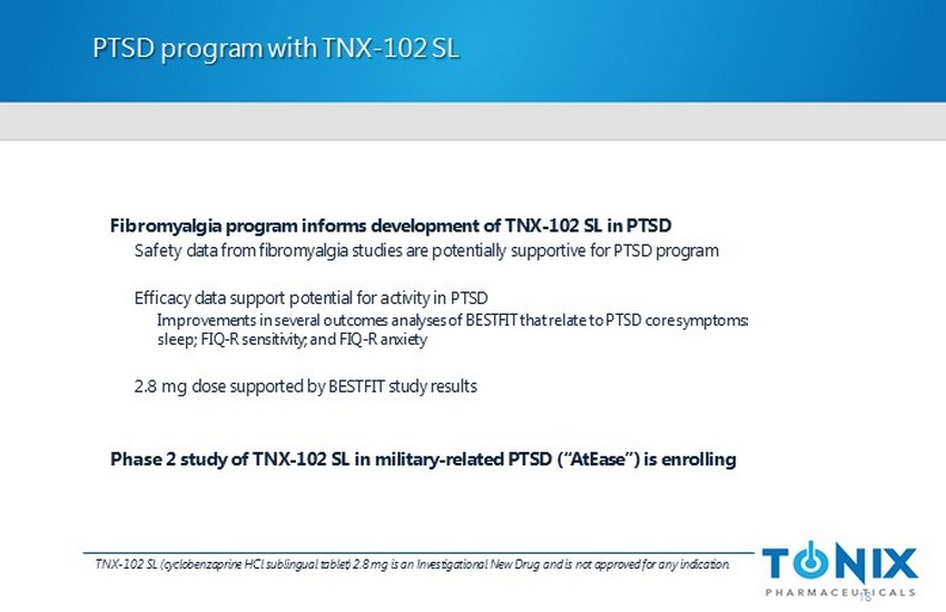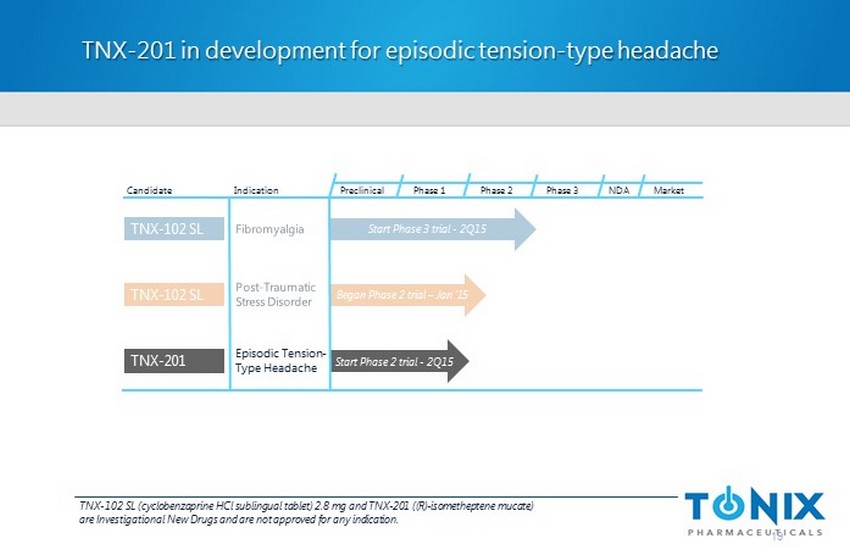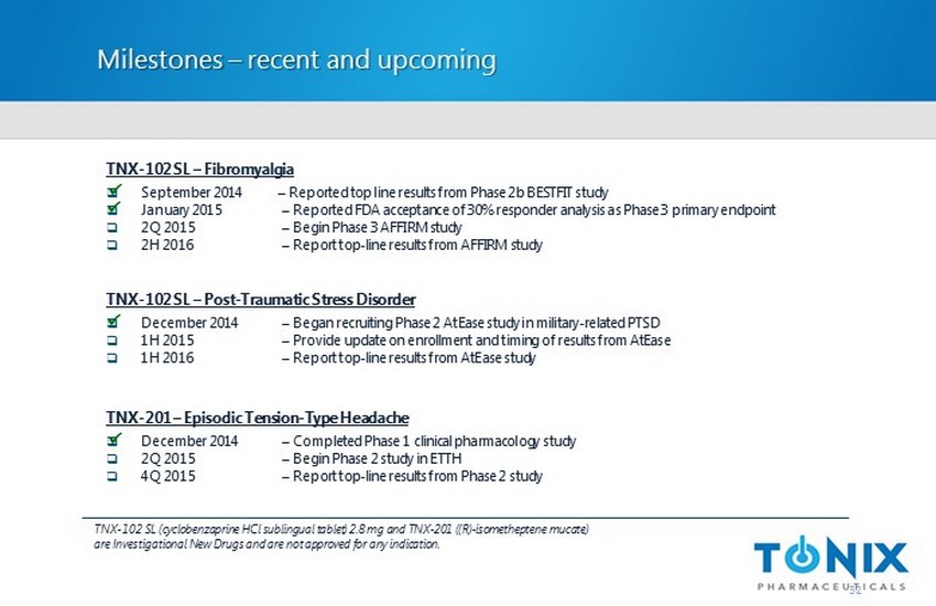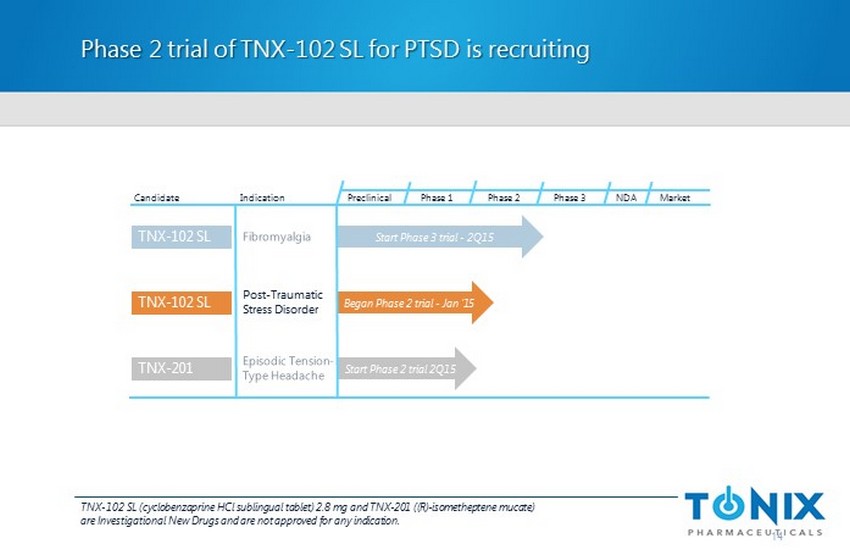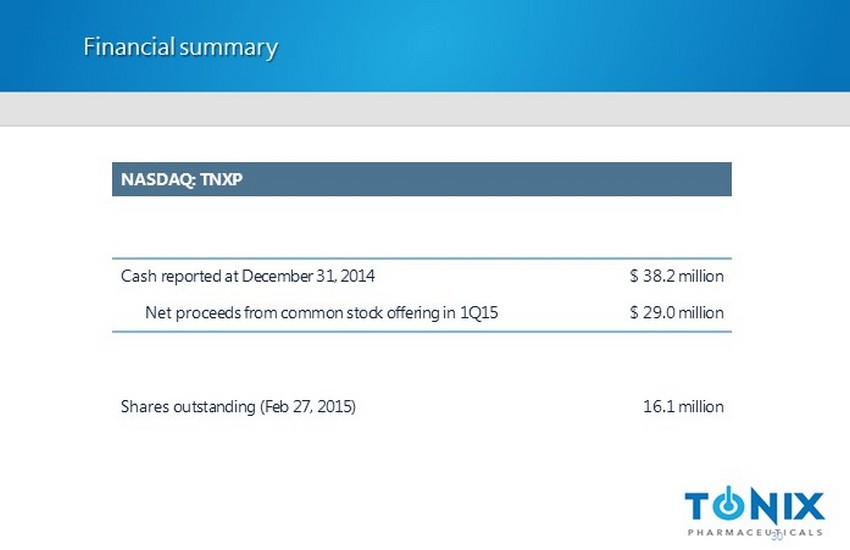Financial summary NASDAQ: TNXP Cash reported at December 31 , 2014 $ 38.2 million Net proceeds from common stock offering in 1Q15 $ 29.0 million Shares outstanding (Feb 27, 2015) 16.1 million 30
