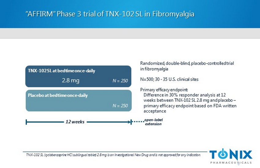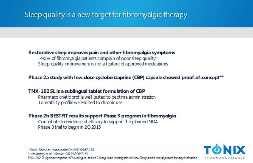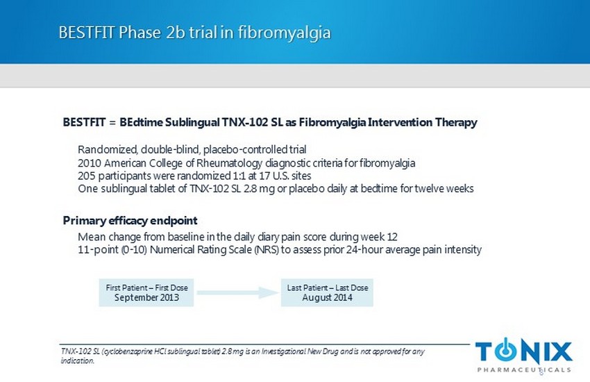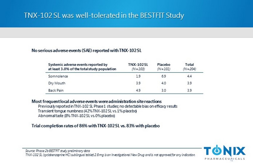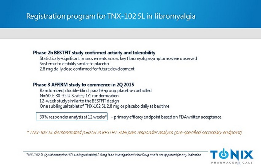 TNX - 102 SL was well - tolerated in the BESTFIT Study 12 No serious adverse events (SAE) reported with TNX - 102 SL Most frequent local adverse events were administration site reactions Previously reported in TNX - 102 SL Phase 1 studies; no detectable bias on efficacy results Transient tongue numbness (42% TNX - 102 SL vs. 1% placebo) Abnormal taste (8% TNX - 102 SL vs. 0% placebo) Trial completion rates of 86% with TNX - 102 SL vs. 83% with placebo Systemic adverse events reported by at least 3.0% of the total study population TNX - 102 SL (N=103) Placebo (N=101) Total (N=204) Somnolence 1.9 6.9 4.4 Dry Mouth 3.9 4.0 3.9 Back Pain 4.9 3.0 3.9 Source: Phase 2b BESTFIT study preliminary data TNX - 102 SL (cyclobenzaprine HCl sublingual tablet) 2.8 mg is an Investigational New Drug and is not approved for any indication.