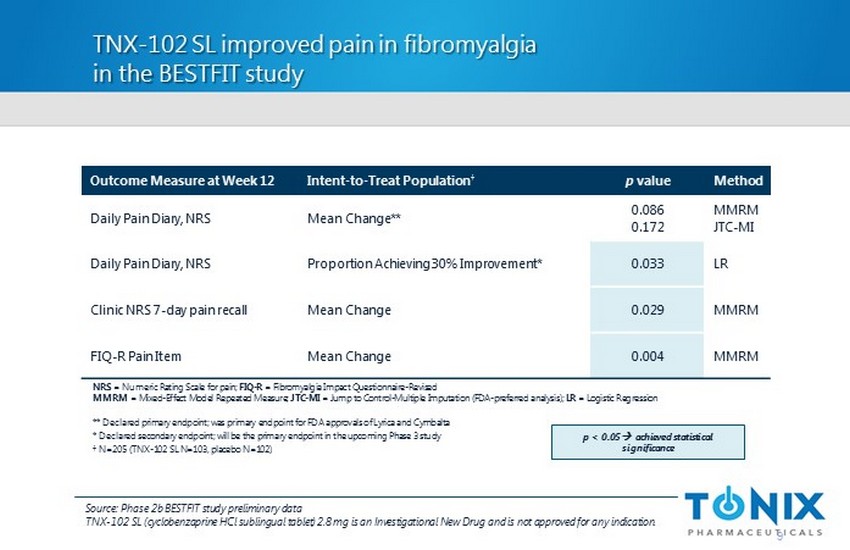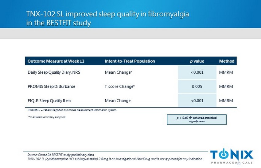 TNX - 102 SL improved sleep quality in fibromyalgia in the BESTFIT study 10 Outcome Measure at Week 12 Intent - to - Treat Population p value Method Daily Sleep Quality Diary, NRS Mean Change* <0.001 MMRM PROMIS Sleep Disturbance T - score Change* 0.005 MMRM FIQ - R Sleep Quality Item Mean Change <0.001 MMRM PROMIS = Patient - Reported Outcomes Measurement Information System * Declared secondary endpoint p < 0.05 ; a chieved statistical significance Source: Phase 2b BESTFIT study preliminary data TNX - 102 SL (cyclobenzaprine HCl sublingual tablet) 2.8 mg is an Investigational New Drug and is not approved for any indication.
