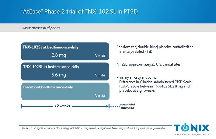 “AtEase” Phase 2 trial of TNX - 102 SL in PTSD Randomized, double - blind, placebo - controlled trial in military - related PTSD N=220; approximately 25 U.S. clinical sites Primary efficacy endpoint: Difference in Clinician - Administered PTSD Scale (CAPS) score between TNX - 102 SL 2.8 mg and placebo at eight weeks TNX - 102 SL at bedtime once - daily Placebo at bedtime once - daily 12 weeks N = 88 17 TNX - 102 SL at bedtime once - daily N = 88 N = 44 2.8 mg 5.6 mg open - label extension TNX - 102 SL (cyclobenzaprine HCl sublingual tablet) 2.8 mg is an Investigational New Drug and is not approved for any indication . www.ateasestudy.com