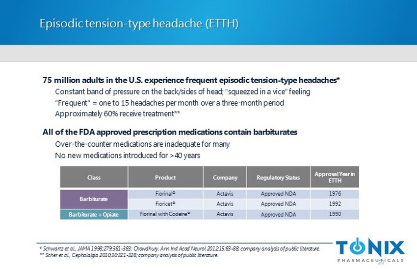 Episodic tension - type headache (ETTH) * Schwartz et al., JAMA 1998;279:381 - 383; Chowdhury, Ann Ind Acad Neurol 2012;15:83 - 88; company analysis of public literature. ** Scher et al., Cephalalgia 2010;30:321 - 328; company analysis of public literature. 75 million adults in the U.S. experience frequent episodic tension - type headaches* Constant band of pressure on the back/sides of head; “squeezed in a vice” feeling “Frequent” = one to 15 headaches per month over a three - month period Approximately 60% receive treatment** All of the FDA approved prescription medications contain barbiturates Over - the - counter medications are inadequate for many No new medications introduced for >40 years Class Product Company Regulatory Status Approval Year in ETTH Barbiturate Fiorinal ® Actavis Approved NDA 1976 Fioricet ® Actavis Approved NDA 1992 Barbiturate + Opiate Fiorinal with Codeine ® Actavis Approved NDA 1990 20