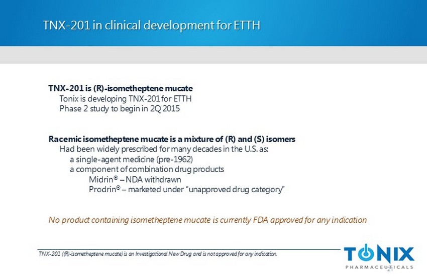 TNX - 201 in development for episodic tension - type headache 19 Preclinical Phase 1 NDA Market Candidate Indication Phase 2 Phase 3 TNX - 102 SL Began Phase 2 trial – Jan ‘15 TNX - 102 SL Start Phase 3 trial - 2Q15 Start Phase 2 trial - 2Q15 TNX - 201 Episodic Tension - Type Headache TNX - 102 SL (cyclobenzaprine HCl sublingual tablet) 2.8 mg and TNX - 201 ( (R) - isometheptene mucate ) are Investigational New Drugs and are not approved for any indication.