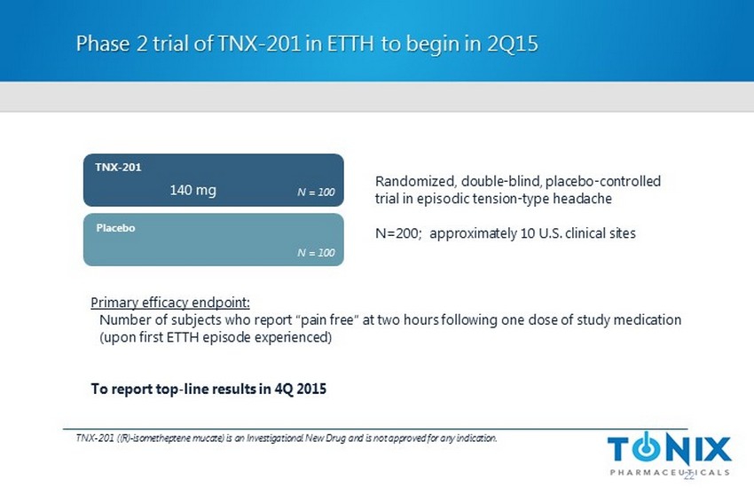 TNX - 201 in clinical development for ETTH TNX - 201 is (R) - isometheptene mucate Tonix is developing TNX - 201 for ETTH Phase 2 study to begin in 2Q 2015 Racemic isometheptene mucate is a mixture of (R) and (S) isomers Had been widely prescribed for many decades in the U.S. as: a single - agent medicine (pre - 1962) a component of combination drug products Midrin ® – NDA withdrawn Prodrin ® – marketed under “unapproved drug category” No product containing isometheptene mucate is currently FDA approved for any indication 21 TNX - 201 ((R) - isometheptene mucate ) is an Investigational New Drug and is not approved for any indication.