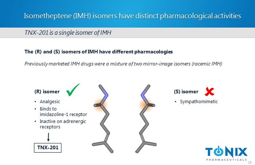 Isometheptene (IMH) isomers have distinct pharmacological activities 23 (R) isomer (S) isomer • Analgesic • Binds to imidazoline - 1 receptor • Inactive on adrenergic receptors • Sympathomimetic The (R) and (S) isomers of IMH have different pharmacologies Previously marketed IMH drugs were a mixture of two mirror - image isomers (racemic IMH) TNX - 201 is a single isomer of IMH x ; TNX - 201