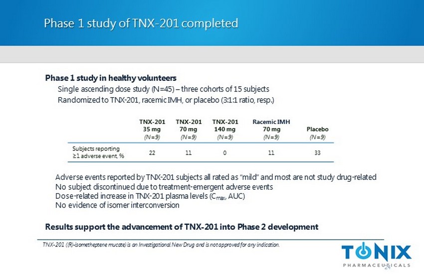 Phase 1 study of TNX - 201 completed Phase 1 study in healthy volunteers Single ascending dose study (N=45) – three cohorts of 15 subjects Randomized to TNX - 201, racemic IMH, or placebo (3:1:1 ratio, resp.) 24 TNX - 201 ((R) - isometheptene mucate ) is an Investigational New Drug and is not approved for any indication. TNX - 201 35 mg (N=9) TNX - 201 70 mg (N=9) TNX - 201 140 mg (N=9) Racemic IMH 70 mg (N=9) Placebo (N=9) Subjects reporting ≥1 adverse event, % 22 11 0 11 33 Adverse events reported by TNX - 201 subjects all rated as “mild” and most are not study drug - related No subject discontinued due to treatment - emergent adverse events Dose - related increase in TNX - 201 plasma levels ( C max , AUC) No evidence of isomer interconversion Results support the advancement of TNX - 201 into Phase 2 development