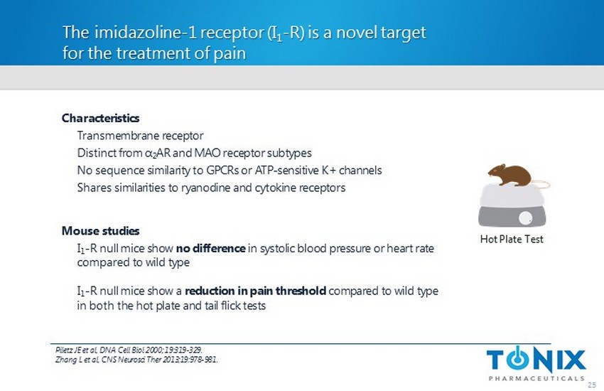 The imidazoline - 1 receptor (I 1 - R) is a novel target for the treatment of pain 25 Hot Plate Test Characteristics Transmembrane receptor Distinct from α 2 AR and MAO receptor subtypes No sequence similarity to GPCRs or ATP - sensitive K+ channels Shares similarities to ryanodine and cytokine receptors Mouse studies I 1 - R null mice show no difference in systolic blood pressure or heart rate compared to wild type I 1 - R null mice show a reduction in pain threshold compared to wild type in both the hot plate and tail flick tests Piletz JE et al, DNA Cell Biol 2000; 19:319 - 329. Zhang L et al, CNS Neurosci Ther 2013;19:978 - 981.