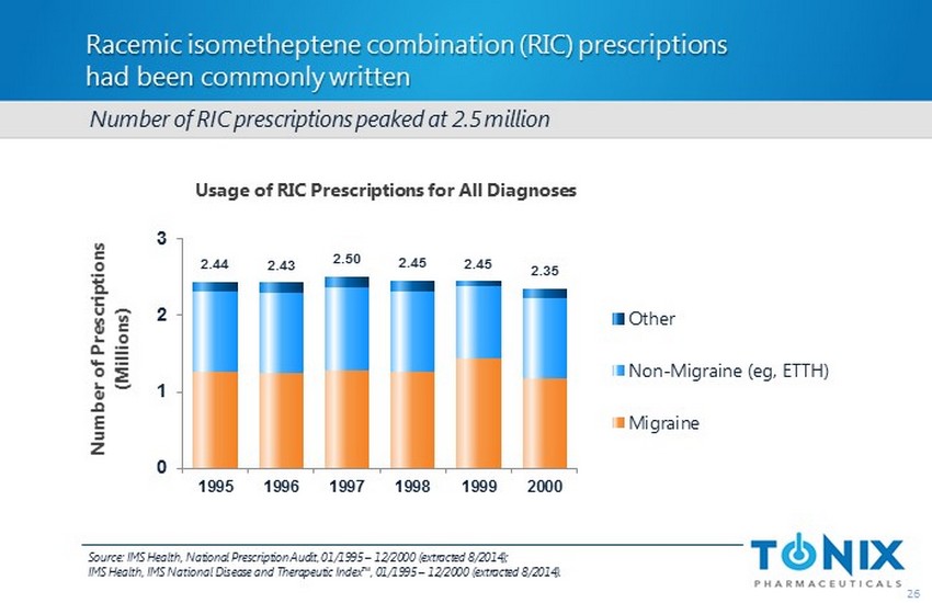 Racemic isometheptene combination (RIC) prescriptions had been commonly written 26 Usage of RIC Prescriptions for All Diagnoses Number of RIC prescriptions peaked at 2.5 million 2.44 2.43 2.50 2.45 2.45 2.35 0 1 2 3 1995 1996 1997 1998 1999 2000 Number of Prescriptions (Millions) Other Non-Migraine (eg, ETTH) Migraine Source : IMS Health, National Prescription Audit, 01/1995 – 12/2000 (extracted 8/2014); IMS Health, IMS National Disease and Therapeutic Index™, 01/1995 – 12/2000 (extracted 8/2014).