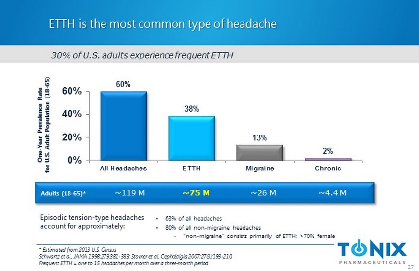 ETTH is the most common type of headache 27 60% 38% 13% 2% 0% 20% 40% 60% All Headaches ETTH Migraine Chronic One - Year Prevalence Rate for U.S. Adult Population (18 - 65) Adults (18 - 65)* * Estimated from 2013 U.S. Census Schwartz et al., JAMA 1998;279:381 - 383; Stovner et al, Cephalalgia 2007;27(3 ): 193 - 210. Frequent ETTH = one to 15 headaches per month over a three - month period • 63 % of all headaches • 80% of all non - migraine headaches • “non - migraine ” consists primarily of ETTH; >70% female ~119 M ~75 M ~26 M ~4.4 M 30% of U.S. adults experience frequent ETTH Episodic tension - type headaches account for approximately: