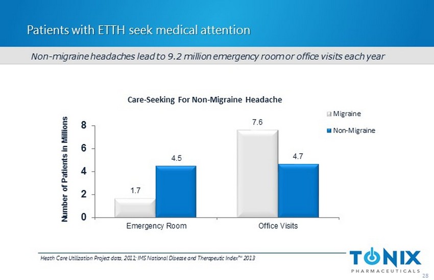 Patients with ETTH seek medical attention 1.7 7.6 4.5 4.7 0 2 4 6 8 Emergency Room Office Visits Number of Patients in Millions Care - Seeking For Non - Migraine Headache Migraine Non-Migraine 28 Heath Care Utilization Project data, 2011; IMS National Disease and Therapeutic Index™ 2013 Non - migraine headaches lead to 9.2 million emergency room or office visits each year