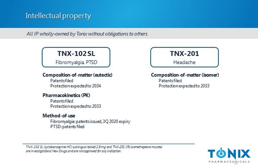 Intellectual property Composition - of - matter (eutectic) Patents filed Protection expected to 2034 Pharmacokinetics (PK) Patents filed Protection expected to 2033 Method - of - use Fibromyalgia: patents issued, 3Q 2020 expiry PTSD: patents filed TNX - 102 SL Fibromyalgia, PTSD TNX - 201 Headache Composition - of - matter (isomer) Patents filed Protection expected to 2033 All IP wholly - owned by Tonix without obligations to others 29 TNX - 102 SL (cyclobenzaprine HCl sublingual tablet) 2.8 mg and TNX - 201 ((R) - isometheptene mucate ) are Investigational New Drugs and are not approved for any indication.