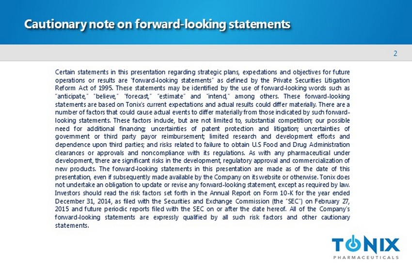 2 Cautionary note on forward - looking statements Certain statements in this presentation regarding strategic plans, expectations and objectives for future operations or results are “forward - looking statements” as defined by the Private Securities Litigation Reform Act of 1995 . These statements may be identified by the use of forward - looking words such as “anticipate,” “believe,” “forecast,” “estimate” and “intend,” among others . These forward - looking statements are based on Tonix’s current expectations and actual results could differ materially . There are a number of factors that could cause actual events to differ materially from those indicated by such forward - looking statements . These factors include, but are not limited to, substantial competition ; our possible need for additional financing ; uncertainties of patent protection and litigation ; uncertainties of government or third party payor reimbursement ; limited research and development efforts and dependence upon third parties ; and risks related to failure to obtain U . S Food and Drug Administration clearances or approvals and noncompliance with its regulations . As with any pharmaceutical under development, there are significant risks in the development, regulatory approval and commercialization of new products . The forward - looking statements in this presentation are made as of the date of this presentation, even if subsequently made available by the Company on its website or otherwise . Tonix does not undertake an obligation to update or revise any forward - looking statement, except as required by law . Investors should read the risk factors set forth in the Annual Report on Form 10 - K for the year ended December 31 , 2014 , as filed with the Securities and Exchange Commission (the “SEC”) on February 27 , 2015 and future periodic reports filed with the SEC on or after the date hereof . All of the Company's forward - looking statements are expressly qualified by all such risk factors and other cautionary statements .