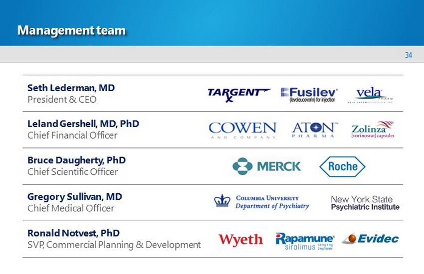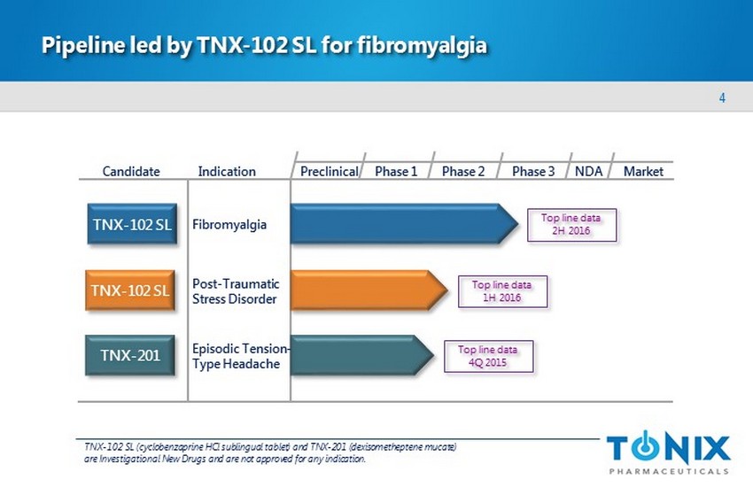 33 Financial overview NASDAQ: TNXP Cash reported at March 31 , 2015 $ 58.2 million Shares outstanding ( June 3, 2015) 16.1 million