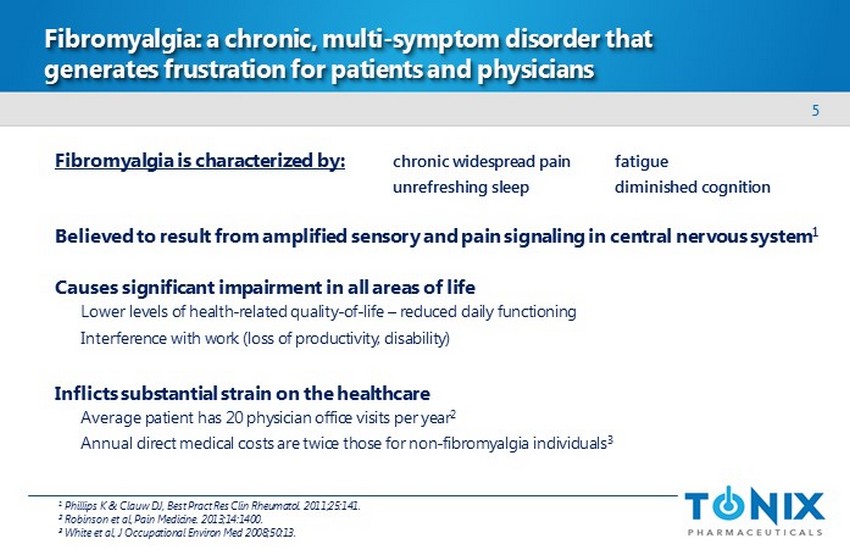 4 Pipeline led by TNX - 102 SL for fibromyalgia Preclinical Phase 1 NDA Market Candidate Indication Phase 2 Phase 3 TNX - 102 SL (cyclobenzaprine HCl sublingual tablet) and TNX - 201 ( dexisometheptene mucate ) are Investigational New Drugs and are not approved for any indication. TNX - 102 SL TNX - 102 SL TNX - 201 Post - Traumatic Stress Disorder Fibromyalgia Episodic Tension - Type Headache Top line data 2H 2016 Top line data 1 H 2016 Top line data 4Q 2015
