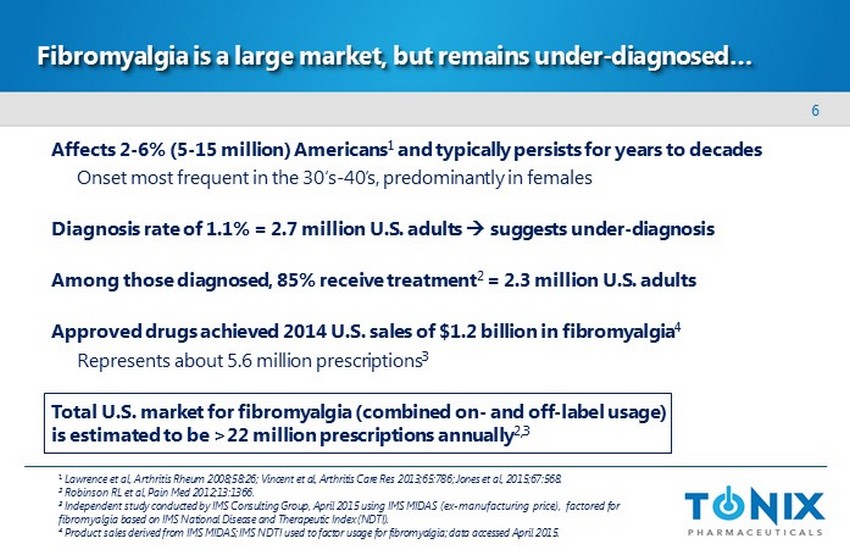 5 Fibromyalgia: a chronic, multi - symptom disorder that generates frustration for patients and physicians 1 Phillips K & Clauw DJ, Best Pract Res Clin Rheumatol . 2011;25:141. 2 Robinson et al, Pain Medicine. 2013;14:1400. 3 White et al, J Occupational Environ Med 2008;50:13. Fibromyalgia is characterized by: chronic widespread pain fatigue u nrefreshing sleep diminished cognition Believed to result from amplified sensory and pain signaling in central nervous system 1 Causes significant impairment in all areas of life Lower levels of health - related quality - of - life – reduced daily functioning Interference with work (loss of productivity, disability) Inflicts substantial strain on the healthcare Average patient has 20 physician office visits per year 2 Annual direct medical costs are twice those for non - fibromyalgia individuals 3