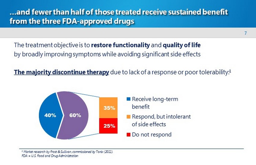 6 Affects 2 - 6% (5 - 15 million) Americans 1 and typically persists for years to decades Onset most frequent in the 30’s - 40’s, predominantly in females Diagnosis rate of 1.1% = 2.7 million U.S. adults ; suggests under - diagnosis Among those diagnosed, 85% receive treatment 2 = 2.3 million U.S. adults A pproved drugs achieved 2014 U.S. sales of $1.2 billion in fibromyalgia 4 Represents about 5.6 million prescriptions 3 Total U.S. market for fibromyalgia (combined on - and off - label usage) is estimated to be >22 million prescriptions annually 2,3 Fibromyalgia is a large market, but remains under - diagnosed… 1 Lawrence et al, Arthritis Rheum 2008;58:26; Vincent et al, Arthritis Care Res 2013;65:786; Jones et al, 2015;67:568. 2 Robinson RL et al, Pain Med 2012;13:1366. 3 Independent study conducted by IMS Consulting Group, April 2015 using IMS MIDAS ( ex - manufacturing price), factored for fibromyalgia based on IMS National Disease and Therapeutic Index (NDTI). 4 Product sales derived from IMS MIDAS; IMS NDTI used to factor usage for fibromyalgia; data accessed April 2015.