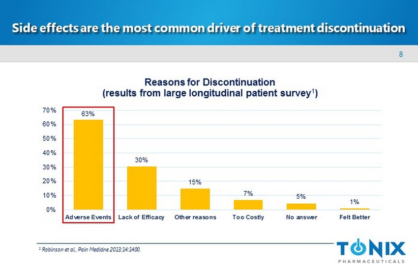 7 Receive long - term benefit Respond, but intolerant of side effects Do not respond 25% 35% 40% 60% 1 Market research by Frost & Sullivan, commissioned by Tonix (2011). FDA = U.S. Food and Drug Administration …and fewer than half of those treated receive sustained benefit from the three FDA - approved drugs The treatment objective is to restore functionality and quality of life b y broadly improving symptoms while avoiding significant side effects The majority discontinue therapy due to lack of a response or poor tolerability: 1