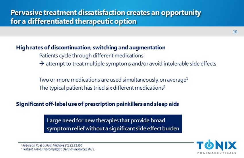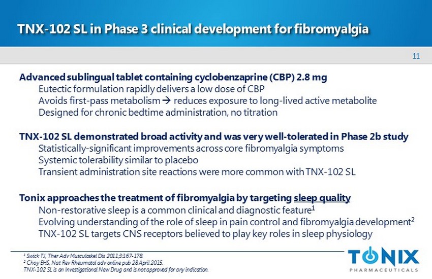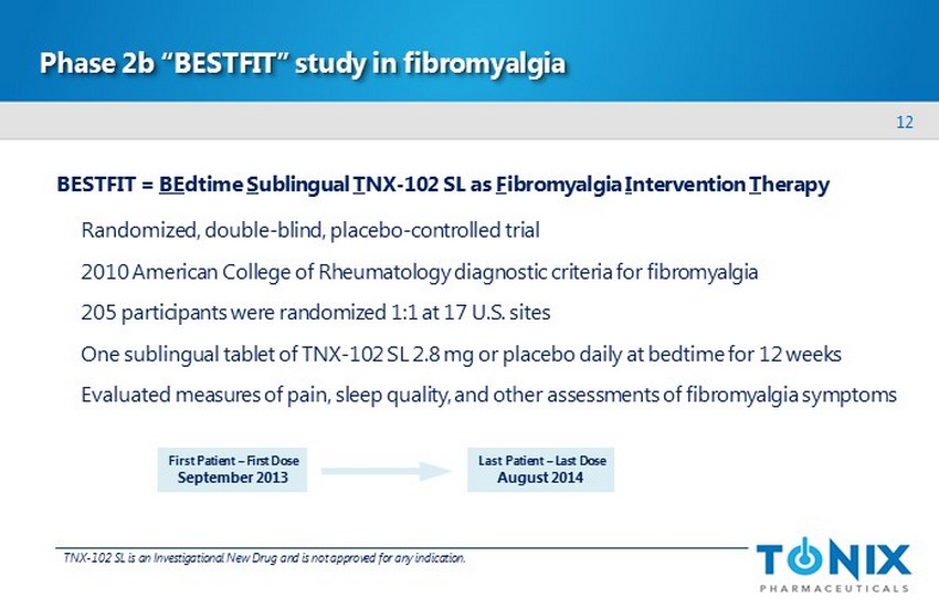 11 Advanced sublingual tablet containing cyclobenzaprine ( CBP) 2.8 mg Eutectic formulation rapidly delivers a low dose of CBP Avoids first - pass metabolism ; reduces exposure to long - lived active metabolite Designed for chronic bedtime administration, no titration TNX - 102 SL demonstrated broad activity and was very well - tolerated in Phase 2b study Statistically - significant improvements across core fibromyalgia symptoms Systemic tolerability similar to placebo Transient a dministration site reactions were more common with TNX - 102 SL Tonix approaches the treatment of fibromyalgia by targeting sleep quality Non - restorative sleep is a common clinical and diagnostic feature 1 Evolving understanding of the role of sleep in pain control and fibromyalgia development 2 TNX - 102 SL targets CNS receptors believed to play key roles in sleep physiology 1 Swick TJ, Ther Adv Musculoskel Dis 2011;3:167 - 178 . 2 Choy EHS, Nat Rev Rheumatol adv online pub 28 April 2015. T NX - 102 SL is an Investigational New Drug and is not approved for any indication . TNX - 102 SL in Phase 3 clinical development for fibromyalgia