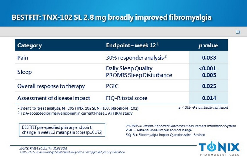 12 Phase 2b “BESTFIT” study in fibromyalgia BESTFIT = BE dtime S ublingual T NX - 102 SL as F ibromyalgia I ntervention T herapy Randomized , double - blind, placebo - controlled trial 2010 American College of Rheumatology diagnostic criteria for fibromyalgia 205 participants were randomized 1:1 at 17 U.S. sites One sublingual tablet of TNX - 102 SL 2.8 mg or placebo daily at bedtime for 12 weeks Evaluated measures of pain, sleep quality, and other assessments of fibromyalgia symptoms First Patient – First Dose September 2013 Last Patient – Last Dose August 2014 TNX - 102 SL is an Investigational New Drug and is not approved for any indication.