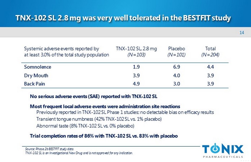 13 BESTFIT: TNX - 102 SL 2.8 mg broadly improved fibromyalgia Category Endpoint – week 12 1 p value Pain 30% responder analysis 2 0.033 Sleep Daily Sleep Quality PROMIS Sleep Disturbance <0.001 0.005 Overal l response to therapy PGIC 0.025 Assessment of disease impact FIQ - R total score 0.014 1 Intent - to - treat analysis, N=205 (TNX - 102 SL N=103, placebo N=102 ) 2 FDA - accepted primary endpoint in current Phase 3 AFFIRM study Source: Phase 2b BESTFIT study data. TNX - 102 SL is an Investigational New Drug and is not approved for any indication. BESTFIT pre - specified primary endpoint: change in week 12 mean pain score (p=0.172) PROMIS = Patient - Reported Outcomes Measurement Information System PGIC = Patient Global Impression of Change FIQ - R = Fibromyalgia Impact Questionnaire - Revised p < 0.05 ; s tatistically significant