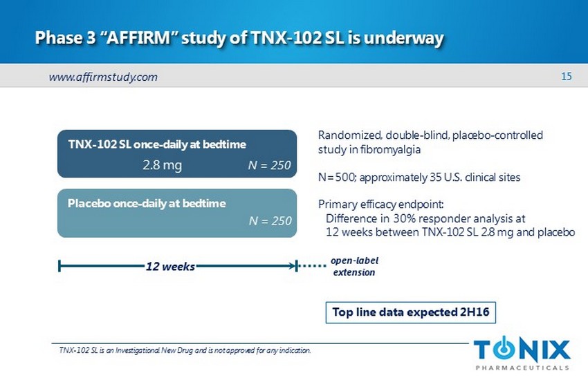 14 TNX - 102 SL 2.8 mg was very well tolerated in the BESTFIT study No serious adverse events (SAE) reported with TNX - 102 SL Most frequent local adverse events were administration site reactions Previously reported in TNX - 102 SL Phase 1 studies; no detectable bias on efficacy results Transient tongue numbness (42% TNX - 102 SL vs. 1% placebo ) Abnormal taste (8% TNX - 102 SL vs. 0% placebo) Trial completion rates of 86% with TNX - 102 SL vs. 83% with placebo Systemic adverse events reported by at least 3.0% of the total study population TNX - 102 SL, 2.8 mg (N=103) Placebo (N=101) Total (N=204) Somnolence 1.9 6.9 4.4 Dry Mouth 3.9 4.0 3.9 Back Pain 4.9 3.0 3.9 Source: Phase 2b BESTFIT study data. TNX - 102 SL is an Investigational New Drug and is not approved for any indication.