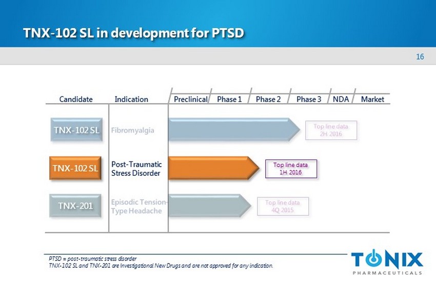 15 Phase 3 “AFFIRM” study of TNX - 102 SL is underway Randomized, double - blind, placebo - controlled study in f ibromyalgia N=500; approximately 35 U.S . clinical sites Primary efficacy endpoint: Difference in 30 % responder analysis at 12 weeks between TNX - 102 SL 2.8 mg and placebo Placebo once - daily at bedtime 12 weeks TNX - 102 SL once - daily at bedtime N = 250 N = 250 2.8 mg open - label extension TNX - 102 SL is an Investigational New Drug and is not approved for any indication . Top line data expected 2H16 www.affirmstudy.com