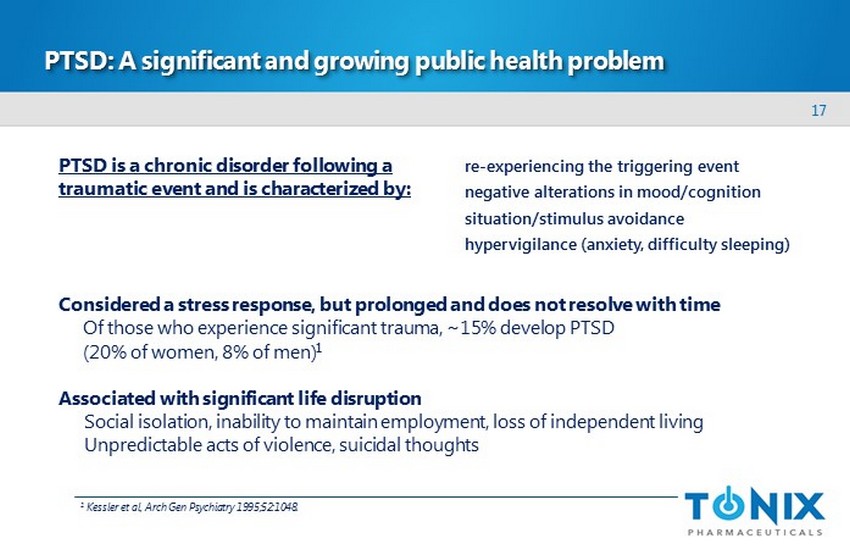 16 TNX - 102 SL in development for PTSD Preclinical Phase 1 NDA Market Candidate Indication Phase 2 Phase 3 TNX - 102 SL TNX - 102 SL TNX - 201 Post - Traumatic Stress Disorder Top line data 1 H 2016 PTSD = post - traumatic stress disorder TNX - 102 SL and TNX - 201 are Investigational New Drugs and are not approved for any indication.