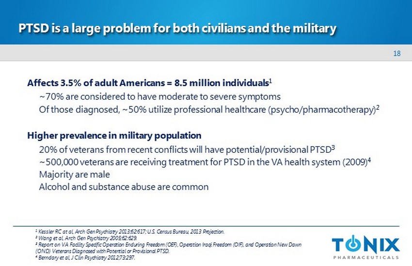 17 PTSD is a chronic disorder following a traumatic event and is characterized by : Considered a stress response, but prolonged and does not resolve with time Of those who experience significant trauma, ~15% develop PTSD (20% of women, 8% of men) 1 Associated with significant life disruption Social isolation, inability to maintain employment, loss of independent living Unpredictable acts of violence, suicidal thoughts PTSD: A significant and growing public health problem 1 Kessler et al, Arch Gen Psychiatry 1995;52:1048. re - experiencing the triggering event negative alterations in mood/cognition situation/stimulus avoidance hypervigilance (anxiety, difficulty sleeping)
