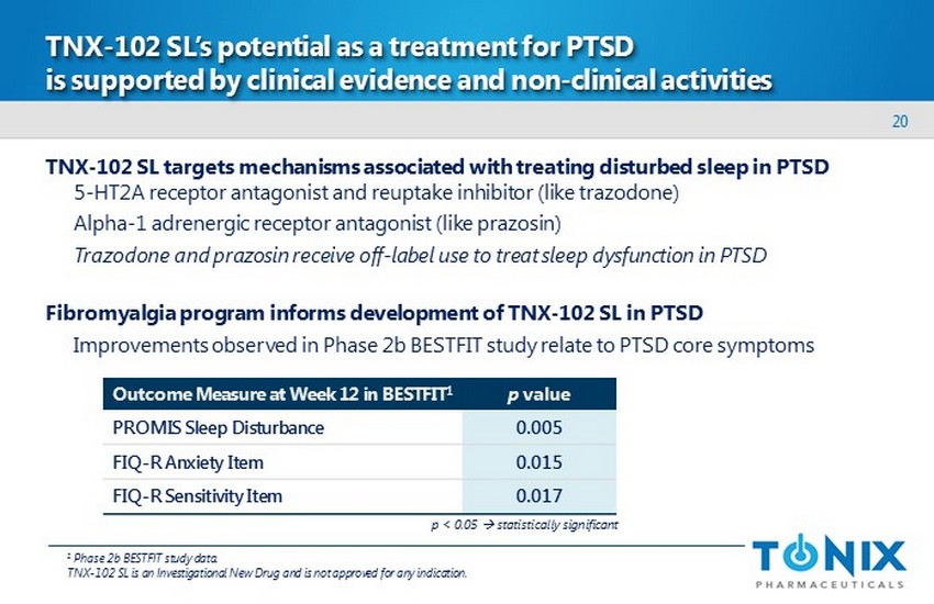 19 Medicines for PTSD often provide inadequate and/or inconsistent benefit FDA - approved medications are limited to two SSRIs, approved >10 years ago Weak evidence of treatment effect in men 1 Lack of evidence of efficacy in those with a history of combat - related trauma 2 Carry suicidality warnings, require dose titration Sleep dysfunction in PTSD is resistant to currently - approved options 95%+ report insomnia, 83% report recurrent dreams of the trauma 3 Correlated with disease severity, depression , substance abuse and suicide 4 Poor sleep quality after trauma may increase the risk of developing PTSD Off - label use of anxiolytics, sedative - hypnotics, opiates, and antipsychotics Significant gap in current therapeutic landscape for PTSD 1 Marshall et al, Am J Psychiatry 2001;158:1982. SSRI = selective serotonin reuptake inhibitor 2 Jonathan Davidson, personal communications, 2014. 3 Green B. Post - traumatic stress disorder: Symptom profiles in men and women. Curr Med Res Opin 2003;19:200 – 4 . 4 Germain et al, J Anxiety Disord 2005;19:233; Krakow et al, J Nerv Ment Dis 2002;190:442.