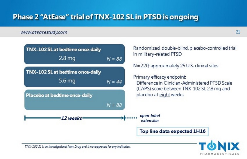 20 TNX - 102 SL’s potential as a treatment for PTSD is supported by clinical evidence and non - clinical activities Outcome Measure at Week 12 in BESTFIT 1 p value PROMIS Sleep Disturbance 0.005 FIQ - R Anxiety Item 0.015 FIQ - R Sensitivity Item 0.017 TNX - 102 SL targets mechanisms associated with treating disturbed sleep in PTSD 5 - HT2A receptor antagonist and reuptake inhibitor (like trazodone) Alpha - 1 adrenergic receptor antagonist (like prazosin ) Trazodone and prazosin receive off - label use to treat sleep dysfunction in PTSD Fibromyalgia program informs development of TNX - 102 SL in PTSD Improvements observed in Phase 2b BESTFIT study relate to PTSD core symptoms 1 Phase 2b BESTFIT study data. TNX - 102 SL is an Investigational New Drug and is not approved for any indication . p < 0.05 ; s tatistically significant