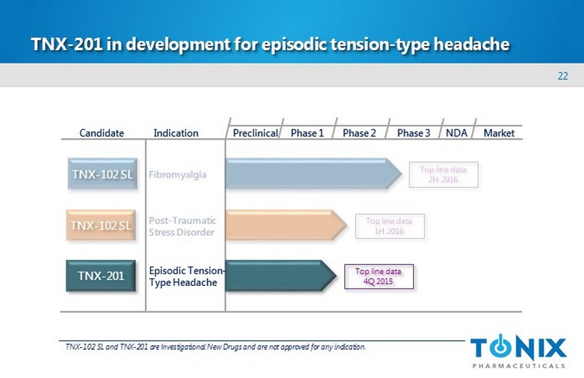 21 Phase 2 “AtEase” trial of TNX - 102 SL in PTSD is ongoing Randomized, double - blind, placebo - controlled trial in military - related PTSD N=220; approximately 25 U.S. clinical sites Primary efficacy endpoint: Difference in Clinician - Administered PTSD Scale (CAPS) score between TNX - 102 SL 2.8 mg and placebo at eight weeks TNX - 102 SL at bedtime once - daily Placebo at bedtime once - daily 12 weeks N = 88 TNX - 102 SL at bedtime once - daily N = 88 N = 44 2.8 mg 5.6 mg open - label extension TNX - 102 SL is an Investigational New Drug and is not approved for any indication . www.ateasestudy.com Top line data expected 1H16