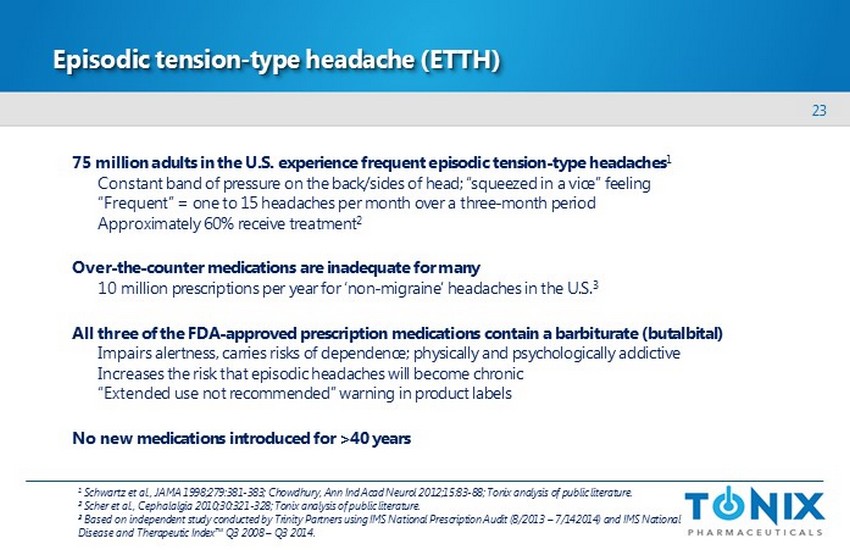 22 TNX - 201 in development for episodic tension - type headache Preclinical Phase 1 NDA Market Candidate Indication Phase 2 Phase 3 TNX - 102 SL TNX - 102 SL TNX - 201 Episodic Tension - Type Headache Top line data 4Q 2015 TNX - 102 SL and TNX - 201 are Investigational New Drugs and are not approved for any indication.