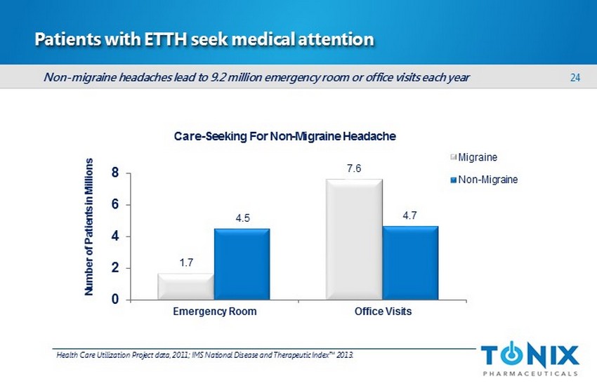 23 Episodic tension - type headache (ETTH) 1 Schwartz et al., JAMA 1998;279:381 - 383; Chowdhury, Ann Ind Acad Neurol 2012;15:83 - 88; Tonix analysis of public literature. 2 Scher et al., Cephalalgia 2010;30:321 - 328; Tonix analysis of public literature . 3 Based on independent study conducted by Trinity Partners using IMS National Prescription Audit (8/2013 – 7/142014) and IMS Nati onal Disease and Therapeutic Index™ Q3 2008 – Q3 2014. 75 million adults in the U.S. experience frequent episodic tension - type headaches 1 Constant band of pressure on the back/sides of head; “squeezed in a vice” feeling “Frequent” = one to 15 headaches per month over a three - month period Approximately 60% receive treatment 2 Over - the - counter medications are inadequate for many 10 million prescriptions per year for ‘non - migraine’ headaches in the U.S. 3 All three of the FDA - approved prescription medications contain a barbiturate ( butalbital ) Impairs alertness , carries risks of dependence; physically and psychologically addictive Increases the risk that episodic headaches will become chronic “Extended use not recommended” warning in product labels No new medications introduced for >40 years