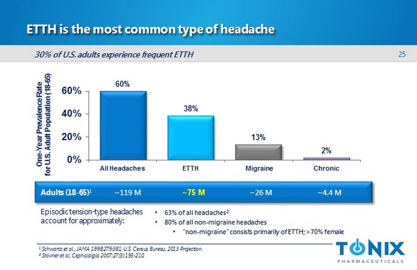 24 Patients with ETTH seek medical attention 1.7 7.6 4.5 4.7 0 2 4 6 8 Emergency Room Office Visits Number of Patients in Millions Care - Seeking For Non - Migraine Headache Migraine Non - Migraine Health Care Utilization Project data, 2011; IMS National Disease and Therapeutic Index™ 2013. Non - migraine headaches lead to 9.2 million emergency room or office visits each year