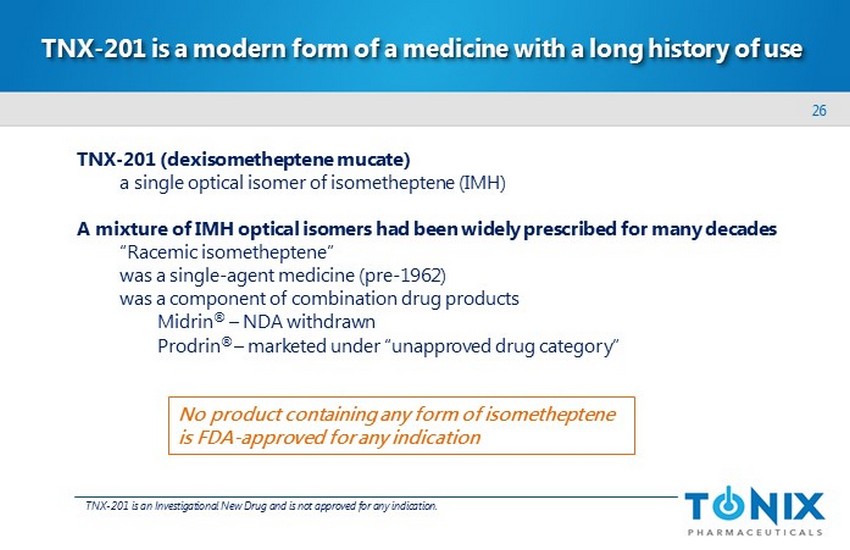 26 TNX - 201 is a modern form of a medicine with a long history of use TNX - 201 ( dexisometheptene mucate ) a single optical isomer of isometheptene (IMH) A mixture of IMH optical isomers had been widely prescribed for many decades “ Racemic isometheptene ” was a single - agent medicine (pre - 1962) was a component of combination drug products Midrin ® – NDA withdrawn Prodrin ® – marketed under “unapproved drug category ” TNX - 201 is an Investigational New Drug and is not approved for any indication. No product containing any form of isometheptene is FDA - approved for any indication