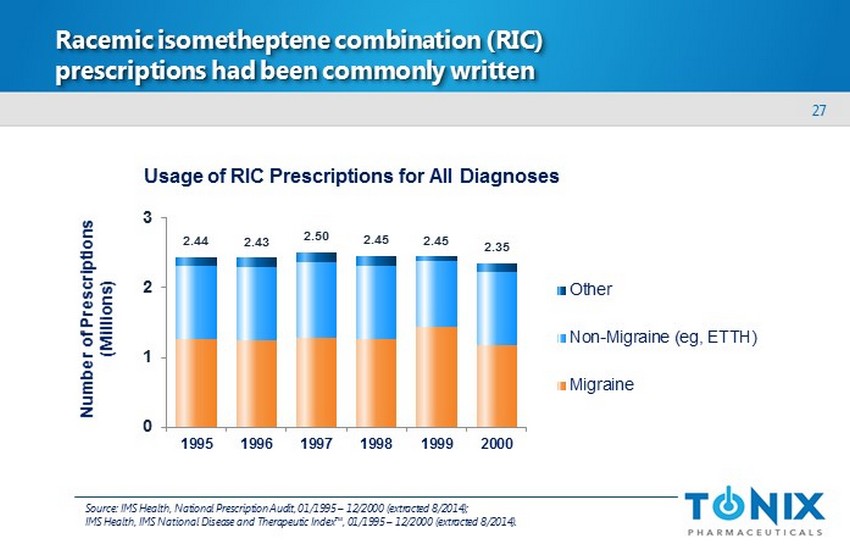 27 Racemic isometheptene combination ( RIC) prescriptions had been commonly written Usage of RIC Prescriptions for All Diagnoses 2.44 2.43 2.50 2.45 2.45 2.35 0 1 2 3 1995 1996 1997 1998 1999 2000 Number of Prescriptions (Millions) Other Non-Migraine (eg, ETTH) Migraine Source : IMS Health, National Prescription Audit, 01/1995 – 12/2000 (extracted 8/2014); IMS Health, IMS National Disease and Therapeutic Index™, 01/1995 – 12/2000 (extracted 8/2014).