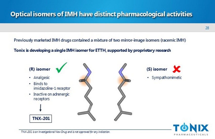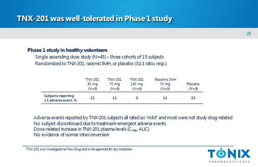 28 Optical isomers of IMH have distinct pharmacological activities (R) isomer (S) isomer • Analgesic • Binds to imidazoline - 1 receptor • Inactive on adrenergic receptors • Sympathomimetic Previously marketed IMH drugs contained a mixture of two mirror - image isomers (racemic IMH) Tonix is developing a single IMH isomer for ETTH, supported by proprietary research x ; TNX - 201 TNX - 201 is an Investigational New Drug and is not approved for any indication.
