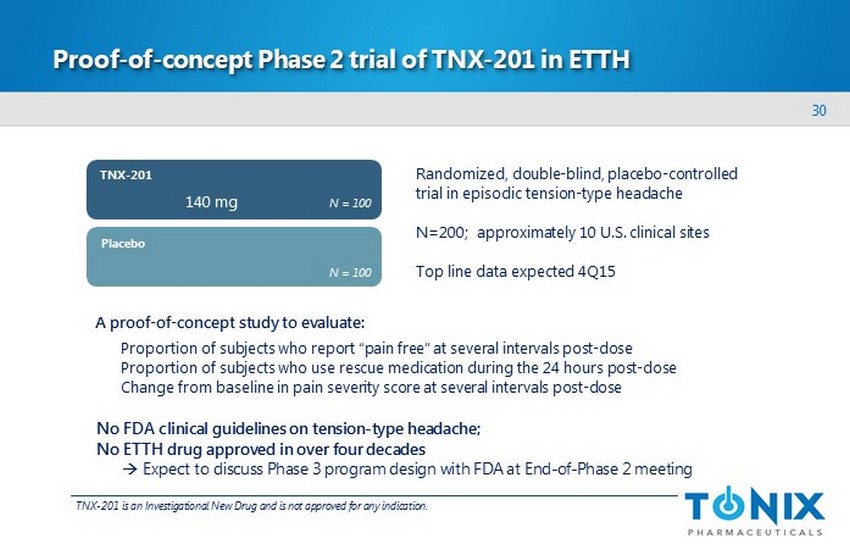 29 TNX - 201 was well - tolerated in Phase 1 study Phase 1 study in healthy volunteers Single ascending dose study (N=45) – three cohorts of 15 subjects Randomized to TNX - 201, racemic IMH, or placebo (3:1:1 ratio, resp.) TNX - 201 is an Investigational New Drug and is not approved for any indication. TNX - 201 35 mg (N=9) TNX - 201 70 mg (N=9) TNX - 201 140 mg (N=9) Racemic IMH 70 mg (N=9) Placebo (N=9) Subjects reporting ≥1 adverse event, % 22 11 0 11 33 Adverse events reported by TNX - 201 subjects all rated as “mild” and most were not study drug - related No subject discontinued due to treatment - emergent adverse events Dose - related increase in TNX - 201 plasma levels ( C max , AUC) No evidence of isomer interconversion