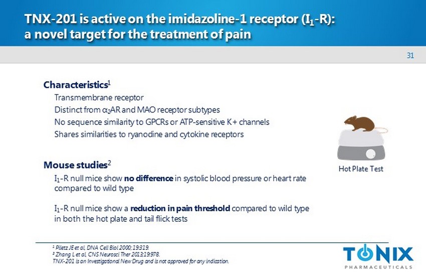 31 TNX - 201 is active on the imidazoline - 1 receptor ( I 1 - R): a novel target for the treatment of pain Hot Plate Test Characteristics 1 Transmembrane receptor Distinct from α 2 AR and MAO receptor subtypes No sequence similarity to GPCRs or ATP - sensitive K+ channels Shares similarities to ryanodine and cytokine receptors Mouse studies 2 I 1 - R null mice show no difference in systolic blood pressure or heart rate compared to wild type I 1 - R null mice show a reduction in pain threshold compared to wild type in both the hot plate and tail flick tests 1 Piletz JE et al, DNA Cell Biol 2000; 19:319. 2 Zhang L et al, CNS Neurosci Ther 2013;19:978. TNX - 201 is an Investigational New Drug and is not approved for any indication .