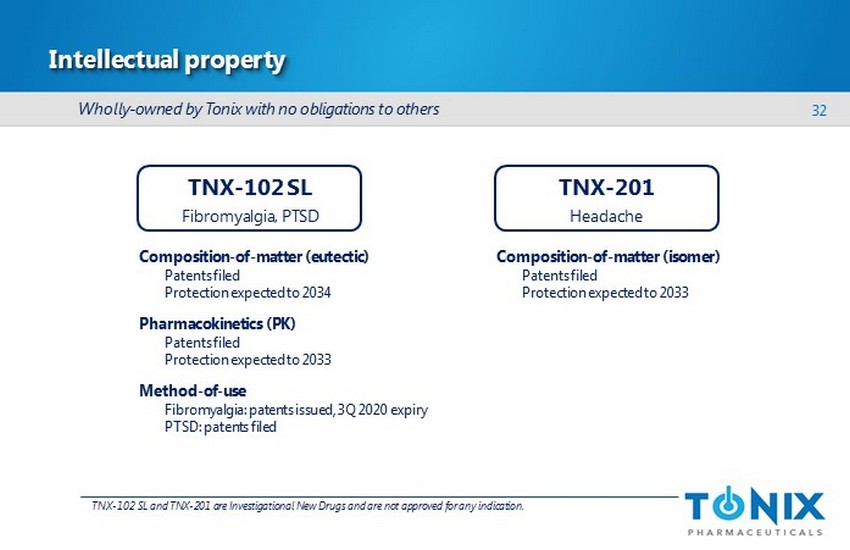32 Intellectual property Composition - of - matter (eutectic) Patents filed Protection expected to 2034 Pharmacokinetics (PK) Patents filed Protection expected to 2033 Method - of - use Fibromyalgia: patents issued, 3Q 2020 expiry PTSD: patents filed TNX - 102 SL Fibromyalgia, PTSD TNX - 201 Headache Composition - of - matter (isomer) Patents filed Protection expected to 2033 Wholly - owned by Tonix with no obligations to others TNX - 102 SL and TNX - 201 are Investigational New Drugs and are not approved for any indication.