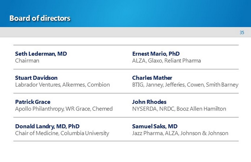 34 Seth Lederman, MD President & CEO Leland Gershell, MD, PhD Chief Financial Officer Bruce Daugherty, PhD Chief Scientific Officer Ronald Notvest, PhD SVP, Commercial Planning & Development Gregory Sullivan, MD Chief Medical Officer Management team
