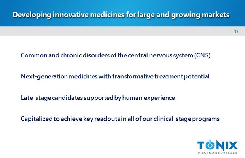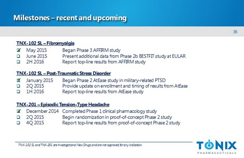 36 TNX - 102 SL – Fibromyalgia □ May 2015 Began Phase 3 AFFIRM study □ June 2015 Present additional data from Phase 2b BESTFIT study at EULAR □ 2H 2016 Report top - line results from AFFIRM study TNX - 102 SL – Post - Traumatic Stress Disorder □ January 2015 Began Phase 2 AtEase study in military - related PTSD □ 2Q 2015 Provide update on enrollment and timing of results from AtEase □ 1H 2016 Report top - line results from AtEase study TNX - 201 – Episodic Tension - Type Headache □ December 2014 Completed Phase 1 clinical pharmacology study □ 2Q 2015 Begin randomization in proof - of - concept Phase 2 study □ 4Q 2015 Report top - line results from proof - of - concept Phase 2 study x x x Milestones – recent and upcoming TNX - 102 SL and TNX - 201 are Investigational New Drugs and are not approved for any indication.