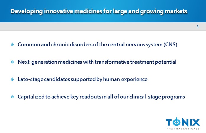 2 Cautionary note on forward - looking statements Certain statements in this presentation regarding strategic plans, expectations and objectives for future operations or results are “forward - looking statements” as defined by the Private Securities Litigation Reform Act of 1995 . These statements may be identified by the use of forward - looking words such as “anticipate,” “believe,” “forecast,” “estimate” and “intend,” among others . These forward - looking statements are based on Tonix’s current expectations and actual results could differ materially . There are a number of factors that could cause actual events to differ materially from those indicated by such forward - looking statements . These factors include, but are not limited to, substantial competition ; our possible need for additional financing ; uncertainties of patent protection and litigation ; uncertainties of government or third party payor reimbursement ; limited research and development efforts and dependence upon third parties ; and risks related to failure to obtain U . S Food and Drug Administration clearances or approvals and noncompliance with its regulations . As with any pharmaceutical under development, there are significant risks in the development, regulatory approval and commercialization of new products . The forward - looking statements in this presentation are made as of the date of this presentation, even if subsequently made available by the Company on its website or otherwise . Tonix does not undertake an obligation to update or revise any forward - looking statement, except as required by law . Investors should read the risk factors set forth in the Annual Report on Form 10 - K for the year ended December 31 , 2014 and Quarterly Report on Form 10 - Q for the period ended June 30 , 2015 , as filed with the Securities and Exchange Commission (the “SEC”) on February 27 , 2015 and August 7 , 2015 , respectively, and future periodic reports filed with the SEC on or after the date hereof . All of the Company's forward - looking statements are expressly qualified by all such risk factors and other cautionary statements .