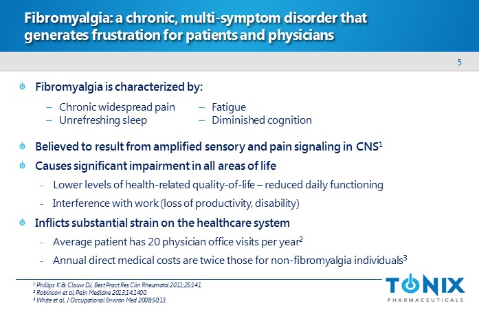 4 Candidate Indication Near - term Catalyst Tonmya Fibromyalgia Top line data 2H 2016 TNX - 102 SL Post - Traumatic Stress Disorder Top line data 1H 2016 TNX - 201 Episodic Tension - Type Headache Top line data 1Q 2016 Pipeline led by Tonmya™ for fibromyalgia Preclinical Phase 1 Phase 2 Phase 3 NDA Market NDA = New Drug Application Tonmya / T NX - 102 SL (cyclobenzaprine HCl sublingual tablets, 2.8 mg) and TNX - 201 ( dexisometheptene mucate ) are Investigational New Drugs and are not approved for any indication.