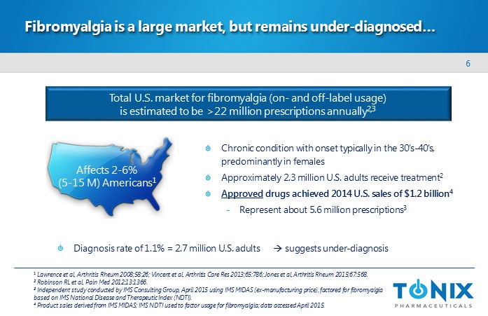 5 Fibromyalgia: a chronic, multi - symptom disorder that generates frustration for patients and physicians Fibromyalgia is characterized by : Believed to result from amplified sensory and pain signaling in CNS 1 Causes significant impairment in all areas of life - Lower levels of health - related quality - of - life – reduced daily functioning - Interference with work (loss of productivity, disability ) Inflicts substantial strain on the healthcare system - Average patient has 20 physician office visits per year 2 - Annual direct medical costs are twice those for non - fibromyalgia individuals 3 1 Phillips K & Clauw DJ, Best Pract Res Clin Rheumatol 2011;25:141. 2 Robinson et al, Pain Medicine 2013;14:1400. 3 White et al, J Occupational Environ Med 2008;50:13. – C hronic widespread pain – Unrefreshing sleep – Fatigue – D iminished cognition