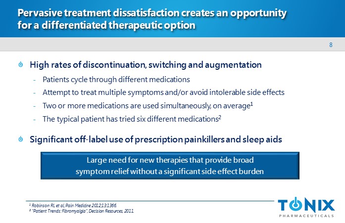 7 …and fewer than half of those treated receive sustained benefit from the three FDA - approved drugs The treatment objective is to restore functionality and quality of life by broadly improving symptoms while avoiding significant side effects The majority fail therapy due to lack of a response or poor tolerability: 1 Respond, but intolerant of side effects Do not respond 25% 35% 40% 60% 1 Market research by Frost & Sullivan, commissioned by Tonix (2011). FDA = U.S. Food and Drug Administration