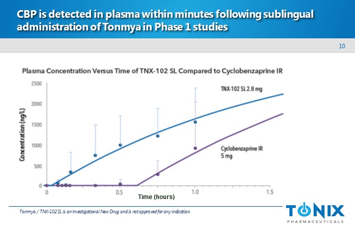 10 CBP is detected in plasma within minutes following sublingual administration of Tonmya in Phase 1 studies Tonmya / TNX - 102 SL is an Investigational New Drug and is not approved for any indication. Time (hours)