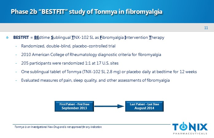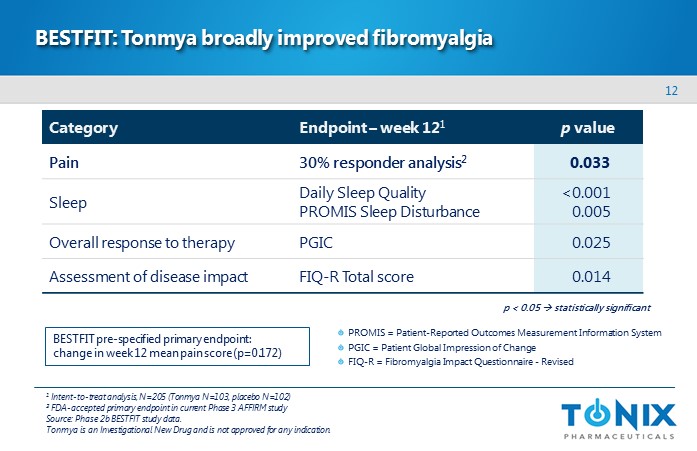 11 Phase 2b “BESTFIT” study of Tonmya in fibromyalgia BESTFIT = BE dtime S ublingual T NX - 102 SL as F ibromyalgia I ntervention T herapy - Randomized , double - blind, placebo - controlled trial - 2010 American College of Rheumatology diagnostic criteria for fibromyalgia - 205 participants were randomized 1:1 at 17 U.S. sites - One sublingual tablet of Tonmya (TNX - 102 SL 2.8 mg) or placebo daily at bedtime for 12 weeks - Evaluated measures of pain, sleep quality, and other assessments of fibromyalgia First Patient – First Dose September 2013 Last Patient – Last Dose August 2014 Tonmya is an Investigational New Drug and is not approved for any indication.