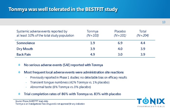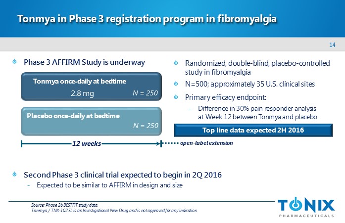 13 Tonmya was well tolerated in the BESTFIT study No serious adverse events (SAE) reported with Tonmya Most frequent local adverse events were administration site reactions - Previously reported in Phase 1 studies; no detectable bias on efficacy results - Transient tongue numbness (42% Tonmya vs . 1% placebo) - Abnormal taste (8% Tonmya vs . 0% placebo) Trial completion rates of 86% with Tonmya vs . 83% with placebo Systemic adverse events reported by at least 3.0% of the total study population Tonmya (N=103) Placebo (N=101) Total (N=204) Somnolence 1.9 6.9 4.4 Dry Mouth 3.9 4.0 3.9 Back Pain 4.9 3.0 3.9 Source: Phase 2b BESTFIT study data. Tonmya is an Investigational New Drug and is not approved for any indication.